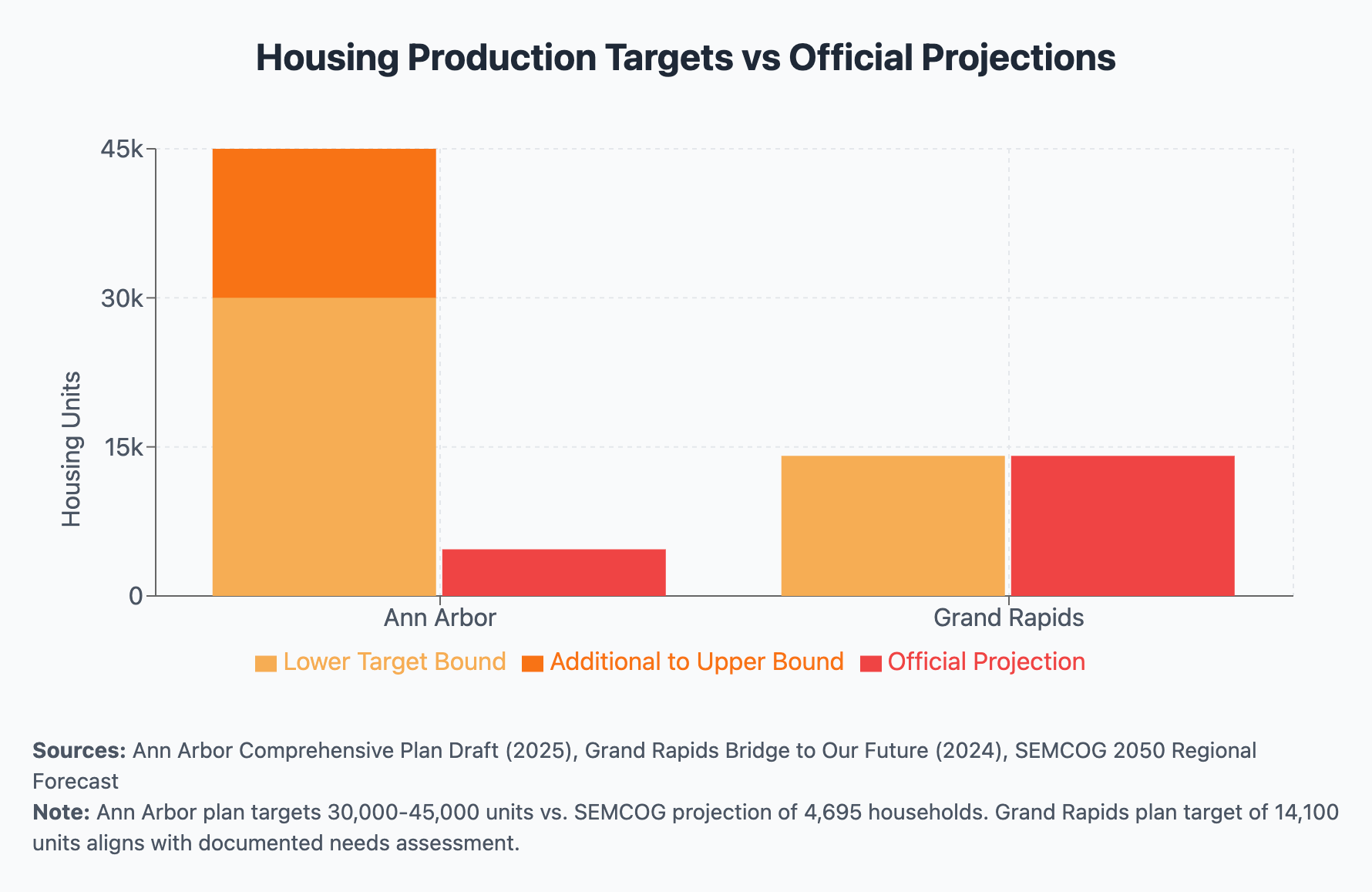 The technical foundation of these plans reveals stark differences in planning rigor and transparency. Ann Arbor's draft relies on outdated baseline data—pre-dating the Statewide Housing Plan launch and missing crucial 2023 updates. Without current vacancy statistics or a data-driven absorption schedule, the extraordinary growth projection (600-900% above SEMCOG forecasts) stands on shaky ground. The plan presents a single preferred land-use scenario without alternatives for comparison.